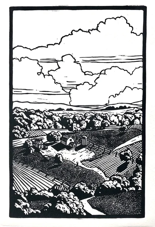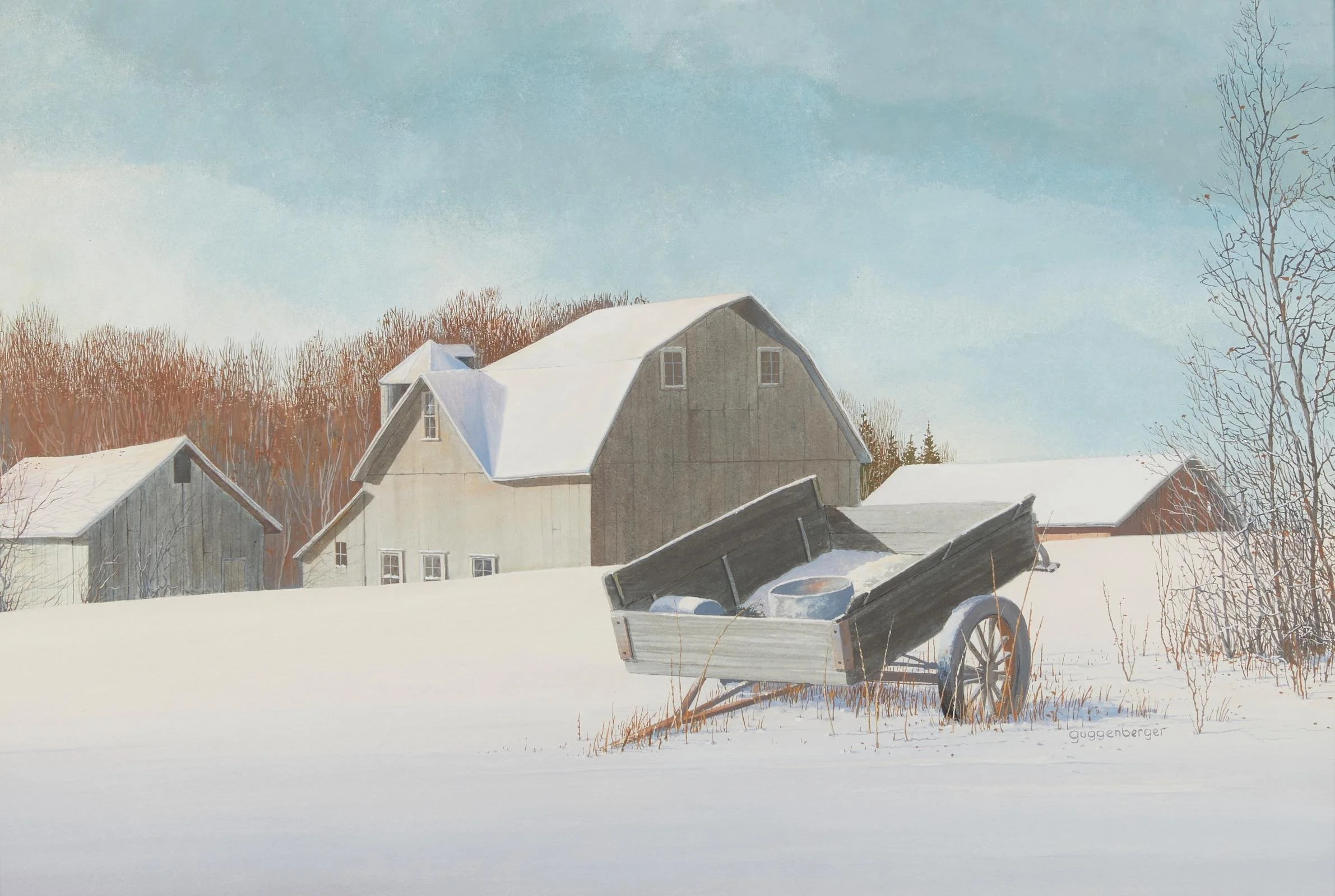 My technique uniquely combines opaque acrylic with transparent watercolor that stylizes the landscape and is influenced by printmakers and batik artists. Their approach to creating negative shapes is similar to how I construct and distill my scenes.